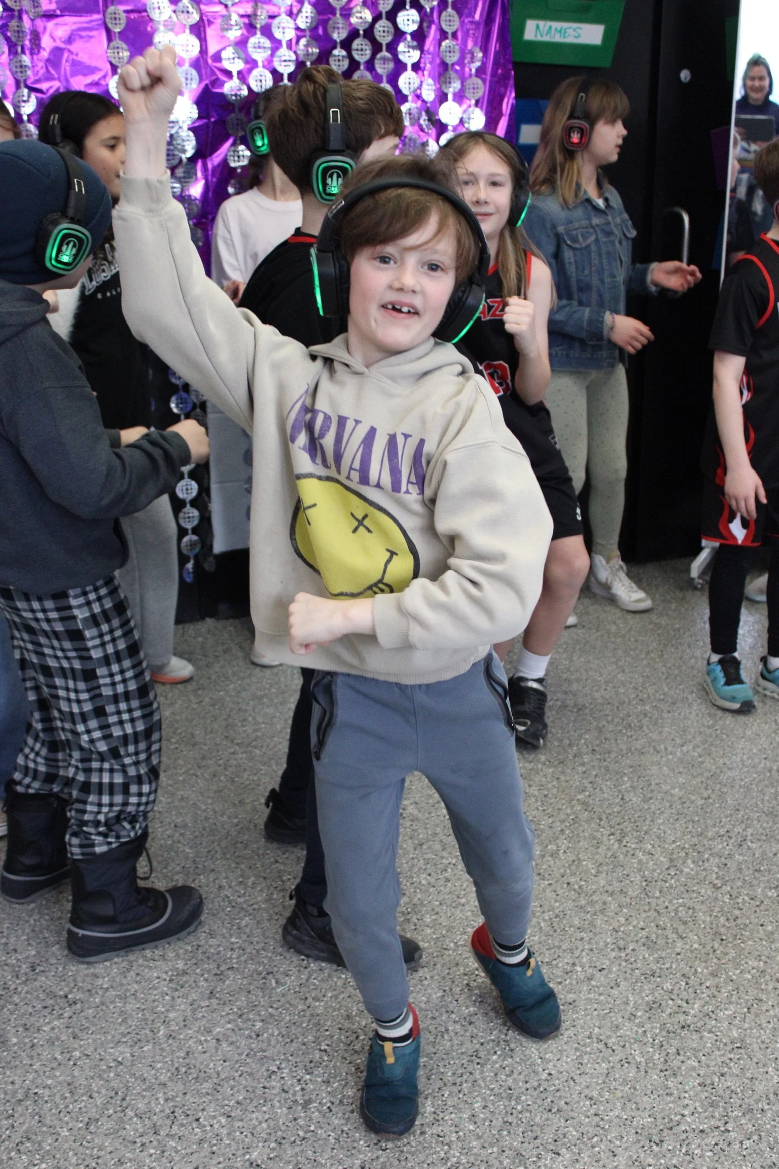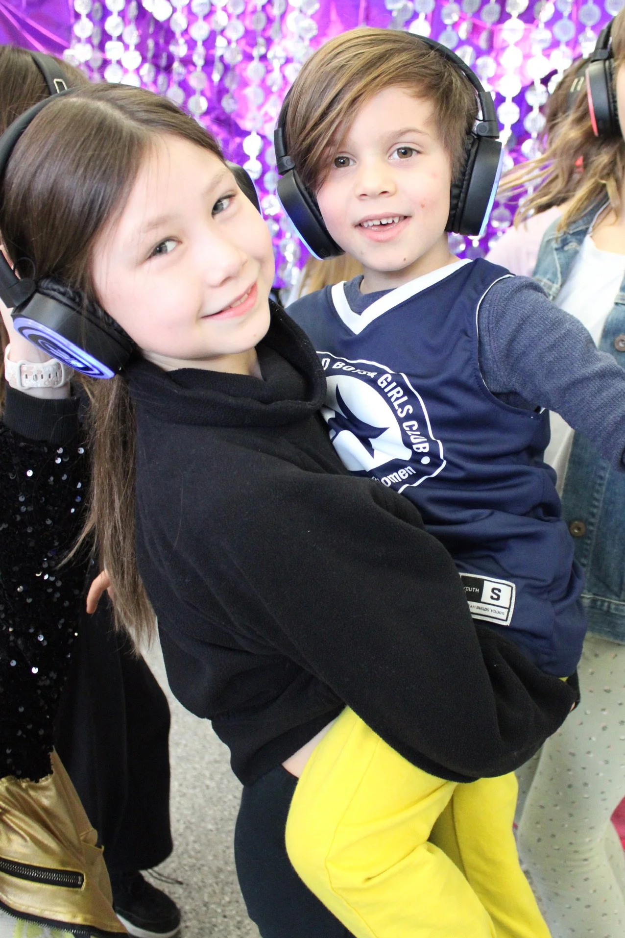Our team brings wireless headphones, transmitters, and our awesome kid- (and adult-) friendly dance mixes, then lead your silent disco dance party.